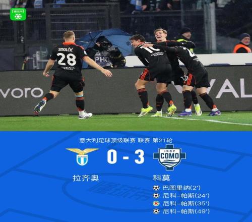 北京时间1月20日,意大利足球顶级联赛第21轮,拉齐奥主场迎战科莫。比赛开局阶段,科莫球员阿莱士-巴列送出助攻,巴图里纳破门得分,为球队取得领先。随后,卡克雷成功策动进攻,帮助尼科-帕斯再下一城。上半场临近结束前,尼科-帕斯主罚点球未能命中,错失扩大比分的机会。易边再战后,巴图里纳完成助攻,尼科-帕斯接应破门,完成个人本场比赛第二次进球。最终全场比分定格在拉齐奥 0-3 科莫。