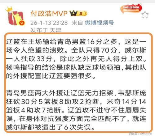 辽篮输给青岛,媒体人付政浩在社媒上写道“在主场输给青岛男篮16分之多,这是一场令人绝望的溃败。全队只得70分,威尔斯一人独砍33分,除此之外再无人得分上双。杨鸣指导的结论是球队缺乏球场领袖,其他队的外援配置比辽篮要强很多。青岛男篮两大外援让辽篮无力招架,韦瑟斯庞狂砍30分5篮板8助攻2抢断,米奇14分14篮板4助攻7抢断。辽篮攻不进守不住屡屡失误,在身体对抗强度方面完全匹配不了,就连威尔斯都被逼出了6次失误。”。